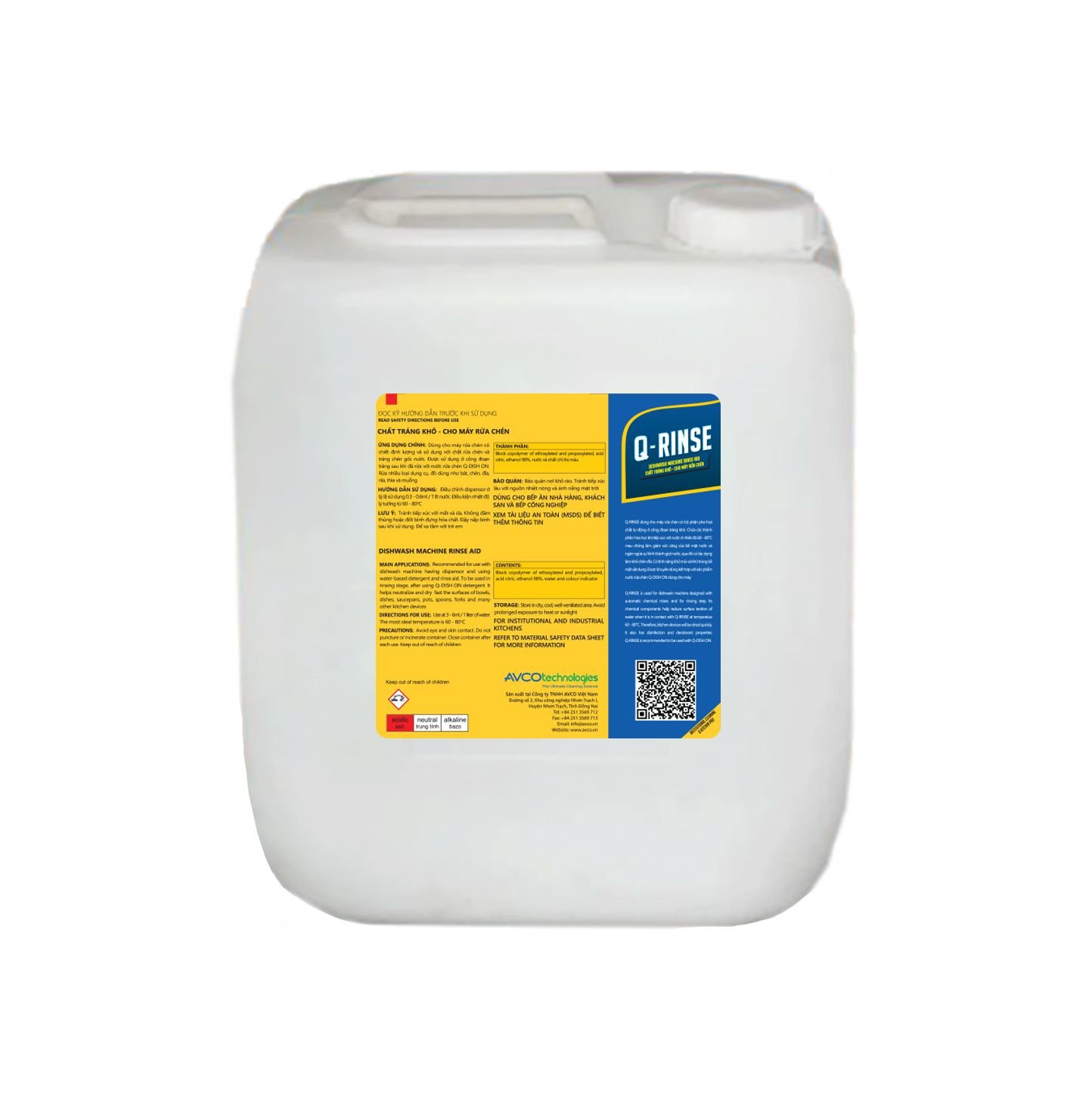 Chất tráng khô cho máy rửa bát Q-RINSE dùng cho máy rửa bát có bộ phận pha hoá chất tự động ở công đoạn tráng khô. Chứa các thành phần hóa học khi tiếp xúc với nước ở nhiệt độ 60 – 85°C, mau chóng làm giảm sức căng của bề mặt nước và ngăn ngừa sự hình thành giọt nước. Qua đó có tác dụng tráng khô bát đĩa. Được khuyên dùng kết hợp với sản phẩm Nước rửa bát dùng cho máy rửa bát Q-DISH ON.